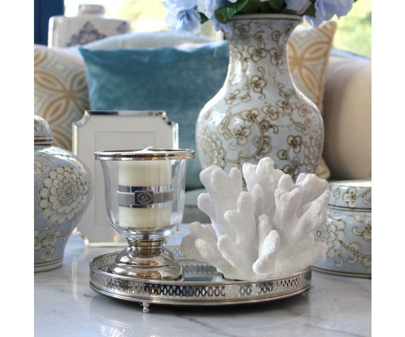 Lampion Floraline marki Eichholtz zachwyca klasycznym kształtem i błyszczącym wykończeniem. Chłodny blask niklu jest doskonałą opozycją do ciepła blasku świecy.