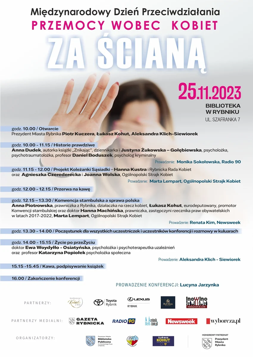- 25 listopada (sobota), godz. 10:00 – 16:00 – konferencja „Za ścianą”, którą otworzą: Piotr Kuczera, Prezydent Miasta Rybnika, Łukasz Kohut, poseł do Parlamentu Europejskiego, oraz Aleksandra Klich-Siewiorek, dyrektorka Powiatowej i Miejskiej Biblioteki Publicznej w Rybniku.