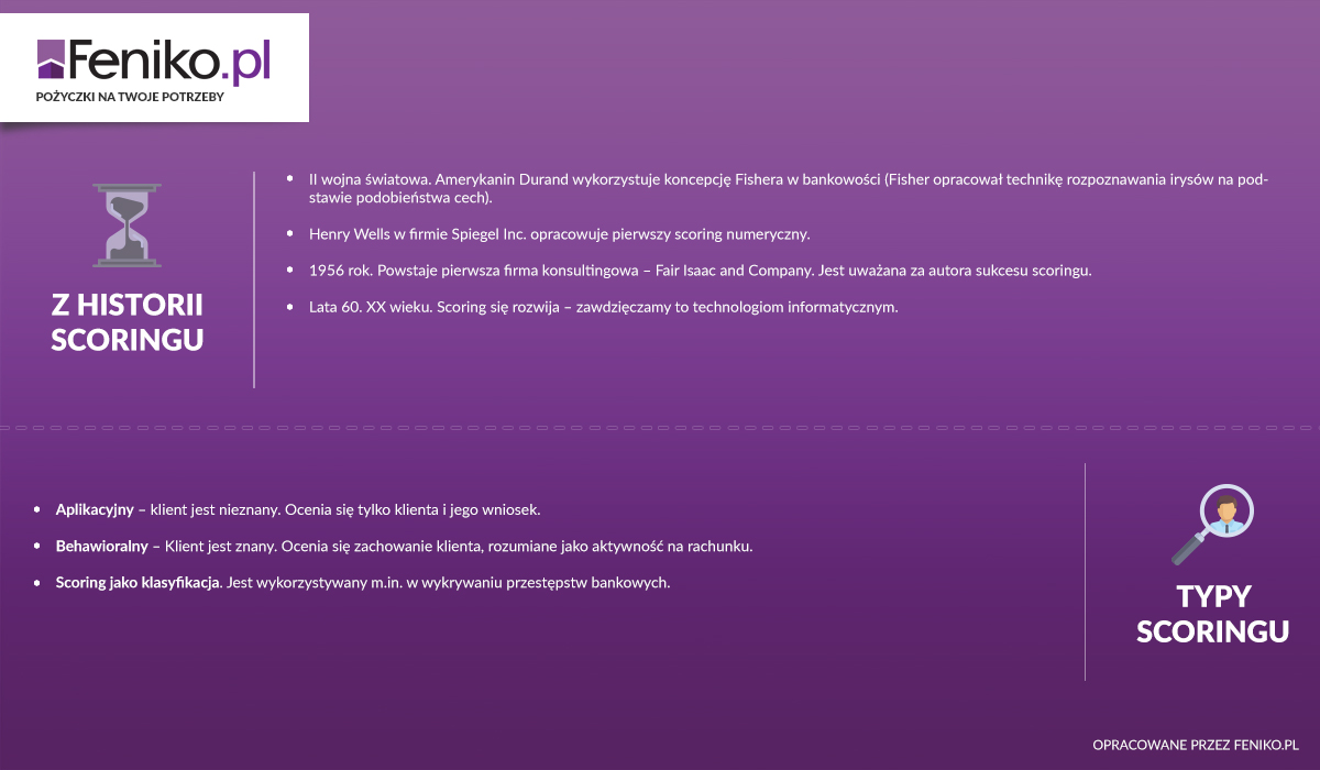 Scoring to nic innego, jak ocena wiarygodności osoby lub firmy, która ubiega się o pożyczkę. Klasyczny scoring, stosowany przez banki, opiera się na metodzie punktowej. Ocenia się poszczególne cechy potencjalnego kredytobiorcy. Następnie porównuje się jego profil z profilem klientów, którzy spłacili kredyt. Im więcej punktów – tym większa szansa na otrzymanie pożyczki. Lista kryteriów, które bierze się pod uwagę przy takiej ocenie jest długa. Znajdziesz na niej m.in.: