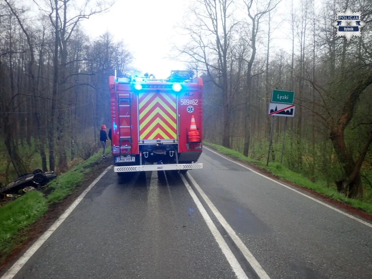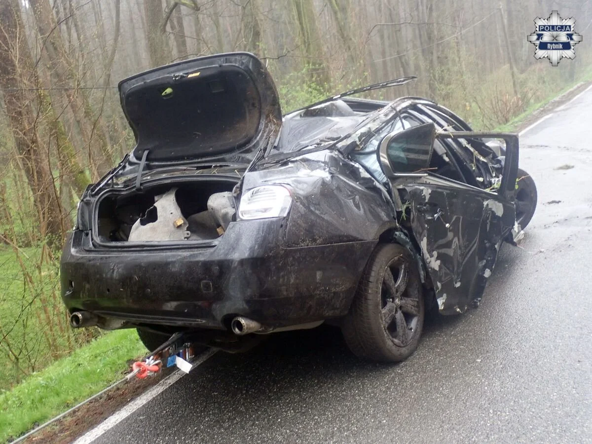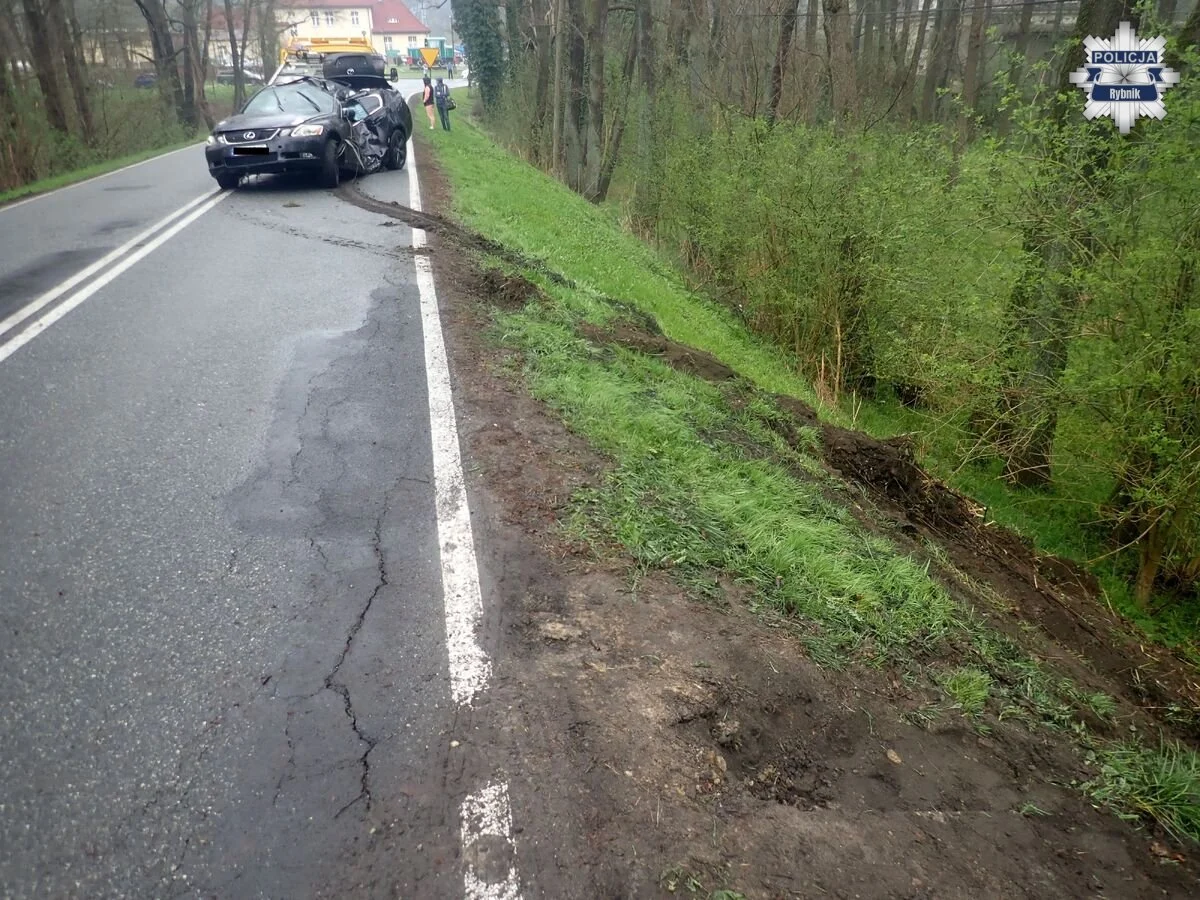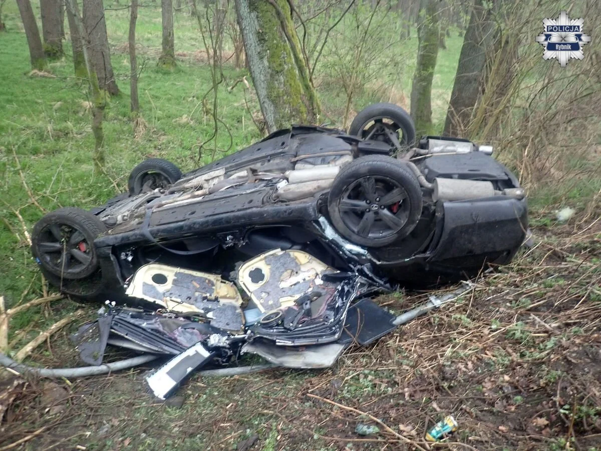 Do zdarzenia doszło w środę około godziny 6.00. Jak przekazała policja, kierujący samochodem osobowym marki Lexus, 23-letni mieszkaniec powiatu rybnickiego, nie dostosował prędkości do warunków panujących na drodze. W efekcie stracił panowanie nad autem, zjechał na lewe pobocze, uderzył w znak drogowy, a następnie dachował i zakończył jazdę na drzewie.