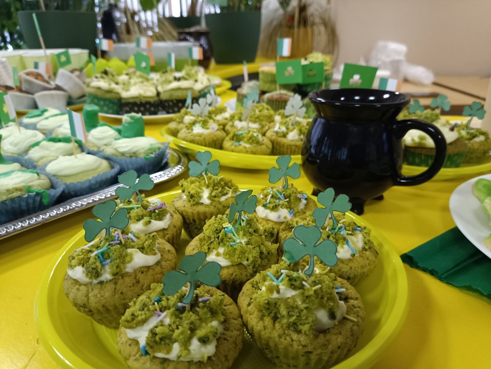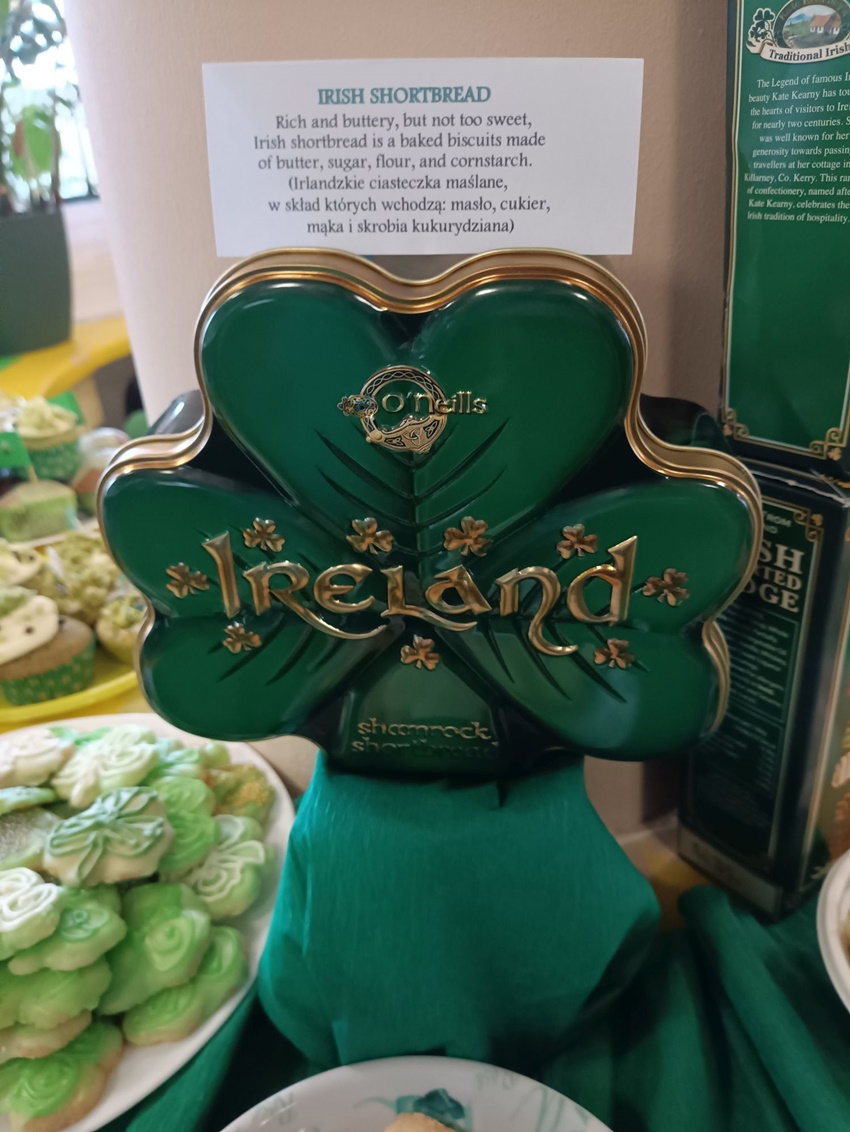 Całej imprezie towarzyszyło oglądanie wystaw przygotowanych przez nauczycieli, przeglądanie książek, sesje zdjęciowe z gościem specjalnym w przygotowanych rekwizytach. Punktem kulminacyjnym jednak było rozdanie nagród za konkurs na symbol Irlandii oraz degustacja przygotowanych smakołyków. W naszym irlandzkim menu znalazły się ciasteczka shortbread biscuits, irlandzkie krówki mleczne Irish dairy cream fudge prosto z Dublina, irlandzkie chipsy Tayto cheese & onion, salt & vinegar crisps, krakersy z irlandzkim solonym masłem Pure Irish Butter Kerrygold, mnóstwo smakowitych babeczek i ciasteczek z zielonym lukrem, a nawet złote czekoladowe monety ze skarbu Leprechauna.