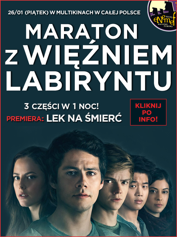 ENEMEF: Maraton z Więźniem Labiryntu odbędzie się 26 stycznia (piątek) jednocześnie w 30 Multikinach w Polsce: Bydgoszcz, Czechowice-Dziedzice, Elbląg, Gdańsk, Gdynia, Jaworzno, Katowice, Kielce, Koszalin, Kraków, Lublin, Łódź, Olsztyn, Poznań 51, Poznań Malta, Radom, Rumia, Rybnik, Rzeszów, Słupsk, Szczecin, Tychy, Warszawa Targówek, Warszawa Ursynów, Warszawa Wola Park, Warszawa Złote Tarasy, Włocławek, Wrocław Pasaż, Zabrze, Zgorzelec.