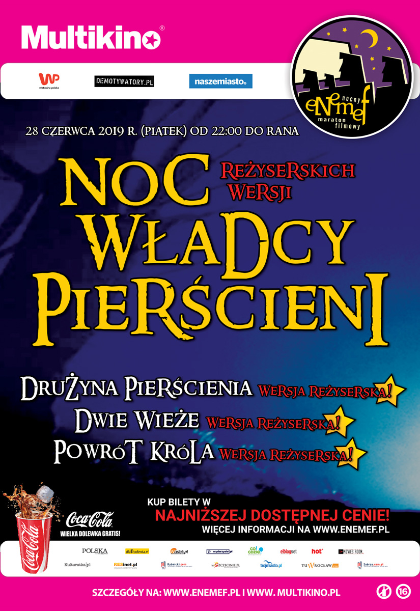 ENEMEF: Noc Reżyserskich Wersji Władcy Pierścieni odbędzie się 28 czerwca 2019 r. (piątek) jednocześnie w 30 Multikinach w Polsce: Bydgoszcz, Czechowice-Dziedzice, Elbląg, Gdańsk, Jaworzno, Katowice, Kielce, Koszalin, Kraków, Lublin, Łódź, Olsztyn, Poznań 51, Poznań Malta, Pruszków, Radom, Rumia, Rybnik, Rzeszów, Słupsk, Szczecin, Tychy, Warszawa Targówek, Warszawa Ursynów, Warszawa Wola, Warszawa Złote Tarasy, Włocławek, Wrocław Pasaż Grunwaldzki, Zabrze, Zgorzelec.