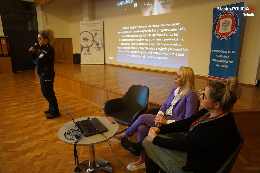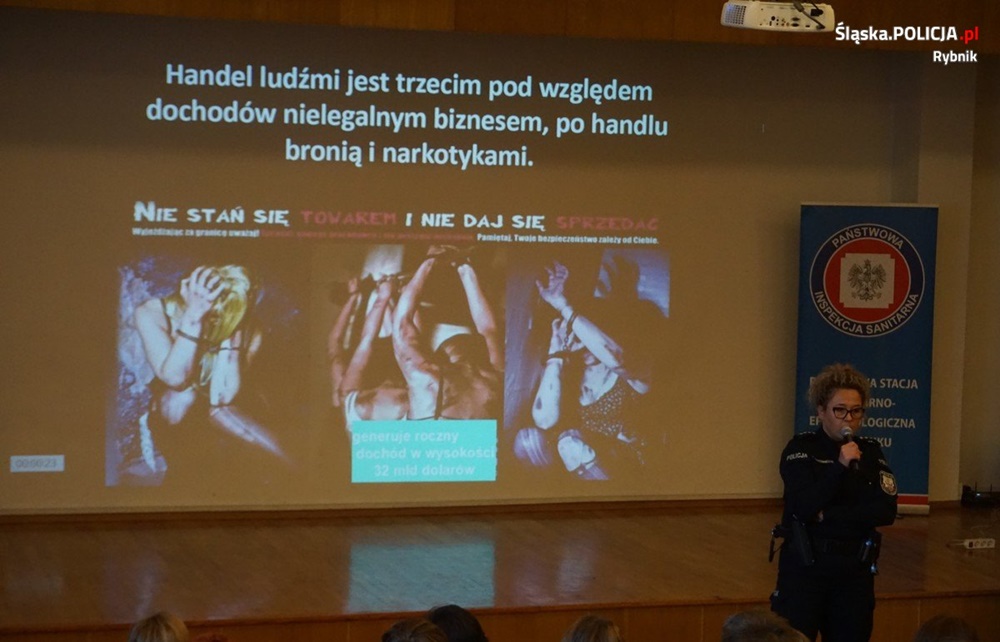 Rybnicką komendę reprezentowała aspirant sztabowy Angelika Strzebinczyk zajmująca się na co dzień profilaktyką społeczną. W trakcie spotkań słuchacze dowiedzieli się, na czym polega zjawisko handlu ludźmi, jakie przybiera formy, jakimi metodami posługują się przestępcy, aby zniewolić ofiary.