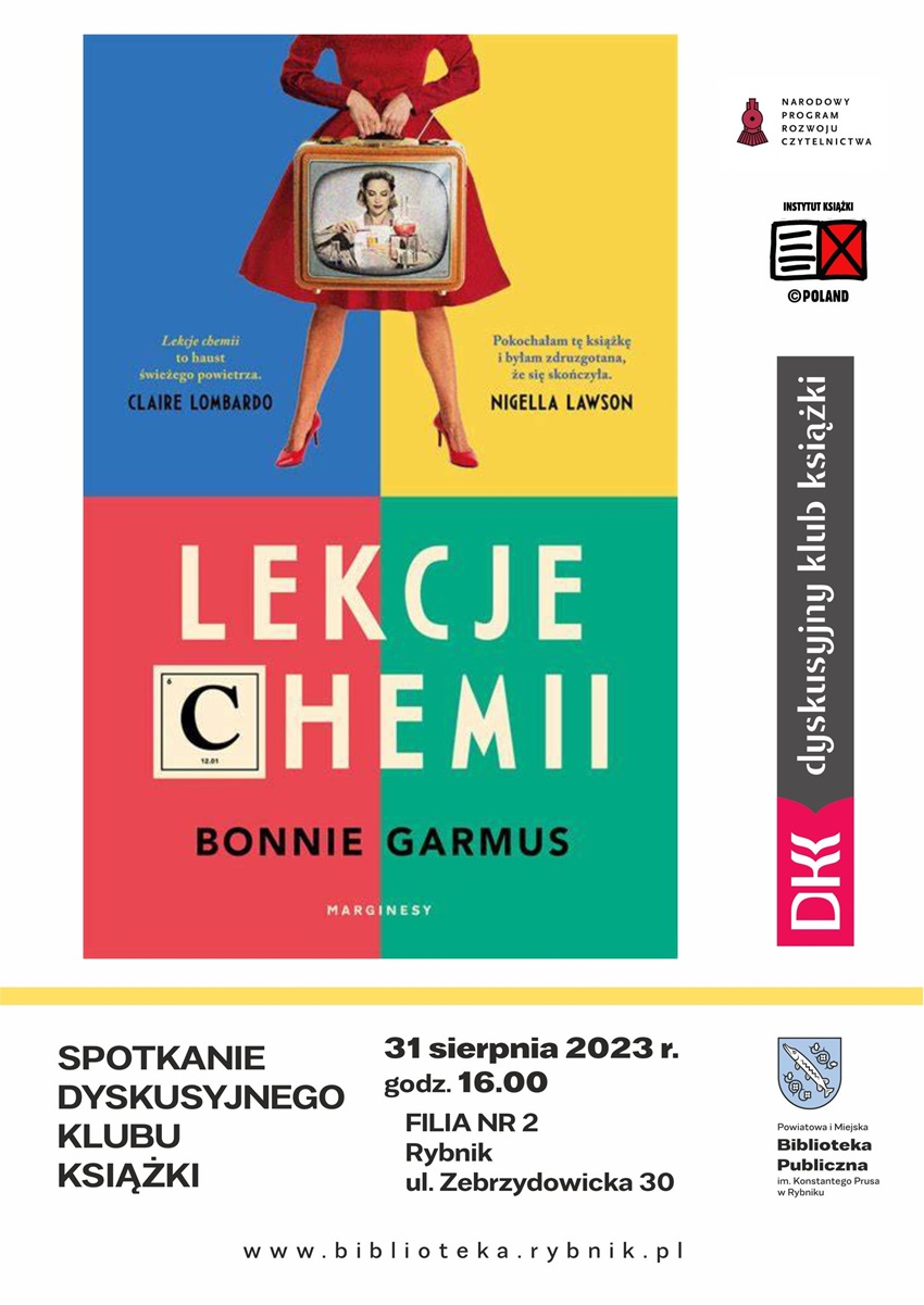 W sierpniu porozmawiacie o książce “Lekcje chemii” Bonnie Garmus, w tłumaczeniu Marka Cieślika. Wstęp jest wolny (zainteresowani w każdej chwili mogą dołączyć). Moderatorem spotkania jest Hanna Koper.