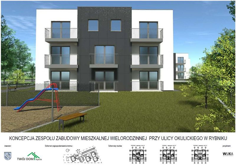 Koncepcja dla ulicy Okulickiego przewiduje budowę czterech wielorodzinnych budynków mieszkalnych z płaskim dachem. Segmenty A i B zaplanowano w układzie szeregowym, segmenty C i D będą wolnostojące. Budynki będą miały trzy kondygnacje, w każdym znajdzie się 8 mieszkań – w sumie powstaną więc 32 lokale mieszkalne. Lokale będą 1-, 2- i 3-pokojowe, o powierzchni w przybliżeniu odpowiednio: 30, 47 i 62 m2. Mieszkania będą miały balkony oraz komórki lokatorskie. Budynki zasilane będą w ciepło z indywidualnych kotłów gazowych. Ciepła woda użytkowa będzie wytwarzana w każdym mieszkaniu indywidualne w kotłach gazowych. W każdym budynku na parterze przeznaczono po jednym mieszkaniu dla osoby niepełnosprawnej bądź starszej (brak windy). Zagospodarowanie terenu przewiduje m.in. budowę parkingu, placu zabaw i chodników – infrastruktura będzie dostosowana do potrzeb osób niepełnosprawnych.