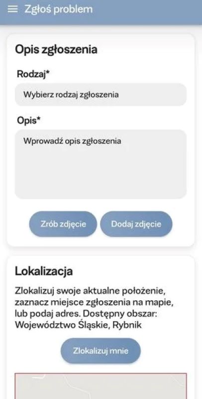 Jedną z ważniejszych funkcjonalności aplikacji jest moduł ZGŁOŚ PROBLEM, dający możliwość zgłaszania problemów czy usterek zauważonych na terenie miasta. Może to być np. niebezpieczne miejsce, awaria oświetlenia ulicznego, problem z wywozem odpadów czy dzikie wysypisko śmieci.