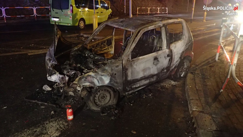 Do wypadku doszło 17 stycznia br., około godziny 4.30 w rejonie skrzyżowania ulicy Kościuszki z Kościelną w Świerklanach. Jak wynika ze wstępnych ustaleń policjantów z rybnickiej drogówki, 59-letni kierujący fiatem seicento, wyjeżdżając z ulicy Kościuszki, na skrzyżowaniu z sygnalizacją świetlną nadającą sygnał zielony, zderzył się z kierującym oplem vivaro. 40-letni kierowca busa jechał ulicą Kościelną w kierunku Wodzisławia Śląskiego. Samochód osobowy stanął w płomieniach i spłonął całkowicie. Mieszkaniec powiatu rybnickiego, kierujący fiatem oraz 61-letni pasażer tego pojazdu zostali zabrani przez zespół pogotowia ratunkowego do szpitala w Rybniku. Policjanci wyjaśniają szczegółowe przyczyny i okoliczności tego zdarzenia.