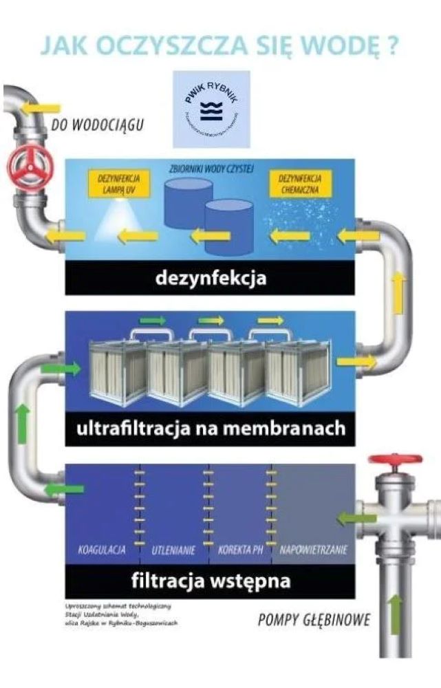 - Kolejny etap oczyszczania polega na oddzieleniu zanieczyszczeń. Woda trafia do zbiorników, gdzie znajdują się membrany ultrafiltracyjne, które składają się z wielu porowatych włókien widocznych za załączonym schemacie. Średnica pora takich membran to 0,04 µm oznacza to, że wszystkie cząstki i substancje zawieszone w wodzie, w tym bakterie i wirusy są zatrzymywane.