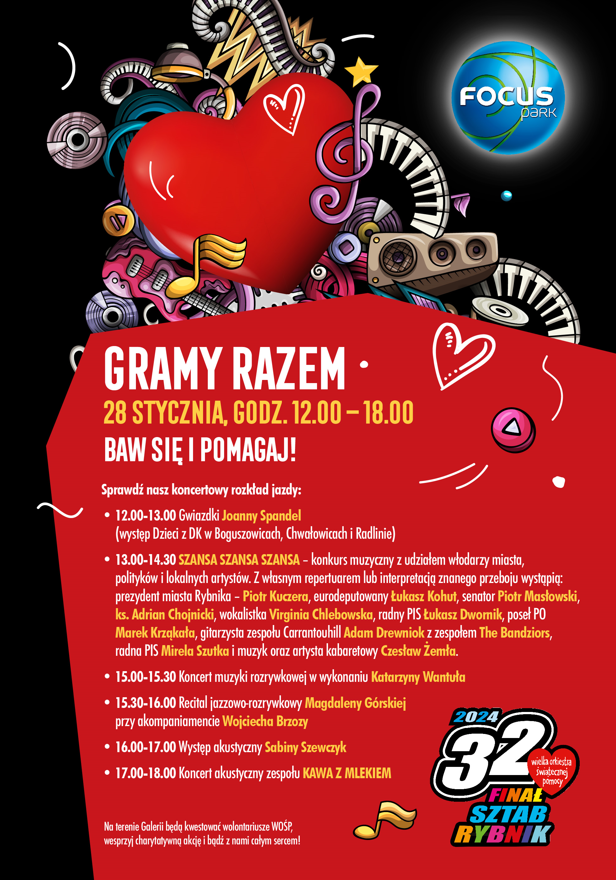 32. finał WOŚP w centrum handlowym Focus Park w Rybniku rozpocznie się o godzinie 12:00 i potrwa do godz. 18:00. Na scenie w Focusie zobaczymy m.in. zespół Kawa z Mlekiem (godz. 17) i innych lokalnych artystów. Posłuchamy m.in. Sabiny Szewczyk, dzieci z Domów Kultury w Chwałowicach, Boguszowicach i Radlinie, a także Katarzynę Wantułę i Magdalenę Górską występującą z Wojciechem Brzozą. “Szansa, szansa, szansa…” z udziałem rybnickich VIP-ów wystartuje o godz. 13:00 i potrwa około półtorej godziny.
