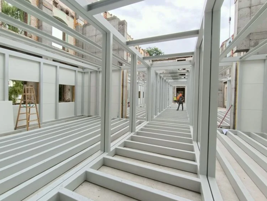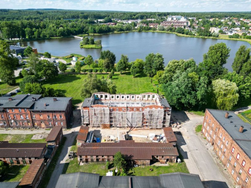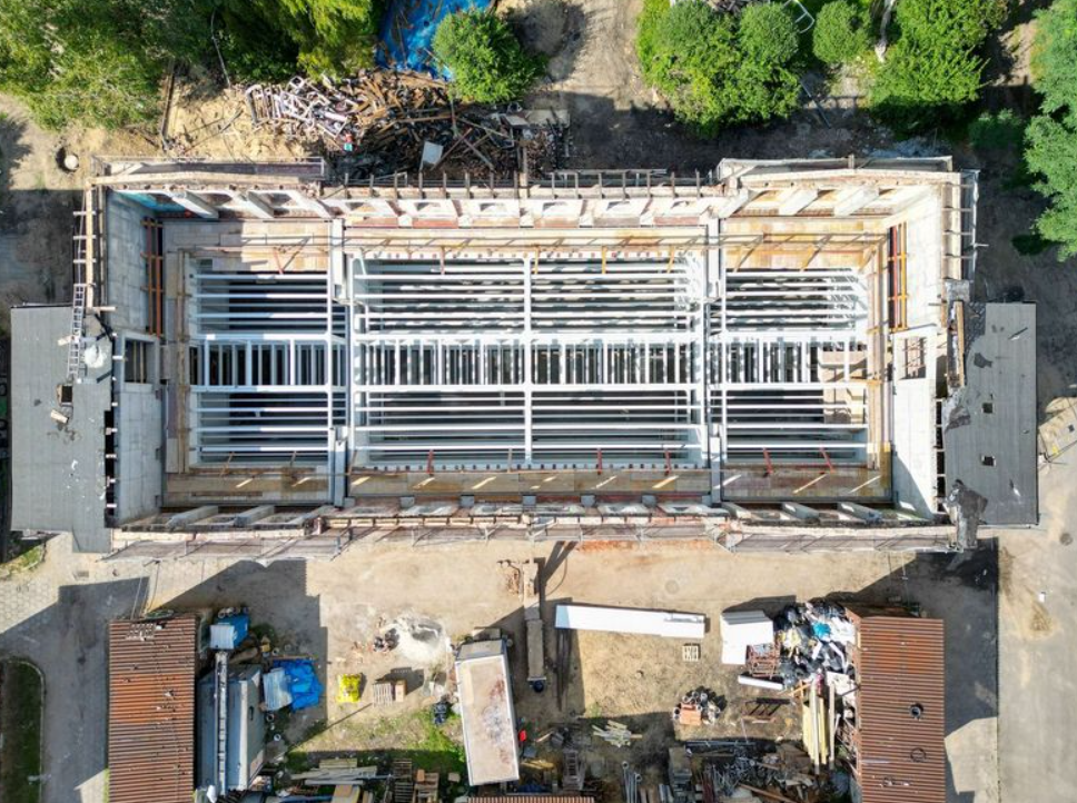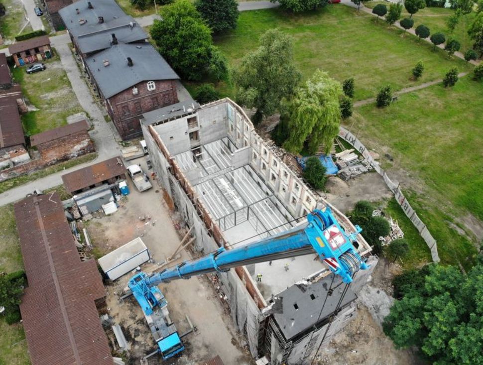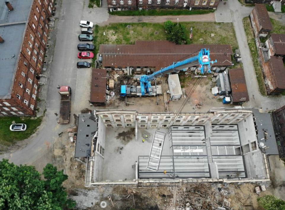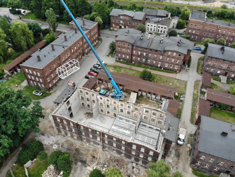 Zakończony został etap związany z rozbiórką poszczególnych stropów, ścian wewnętrznych i dachu. Jednocześnie powstawała złożona konstrukcja żelbetowa, której zadaniem jest zabezpieczenie historycznej tkanki budynku, jak i zapewnienie właściwego posadowienia dla modułów mieszkalnych, wyprodukowanych równolegle w zakładzie prefabrykacji. W pierwszej połowie lipca we wnętrzu modernizowanego budynku zamontowano 40 wykonanych na miarę konstrukcyjnych modułów mieszkaniowych. Na ten moment trwa montaż konstrukcji stalowej pod ostatni strop – informuje Zakład Gospodarki Mieszkaniowej w Rybniku.