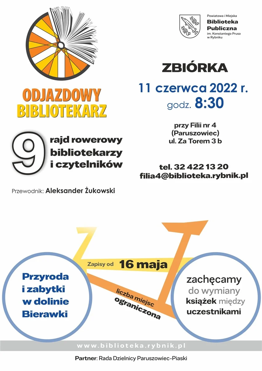Filia nr 4 Powiatowej i Miejskiej Biblioteki Publicznej w Rybniku zaprasza na dziewiąty rajd rowerowy pod nazwą „Odjazdowy Bibliotekarz”.