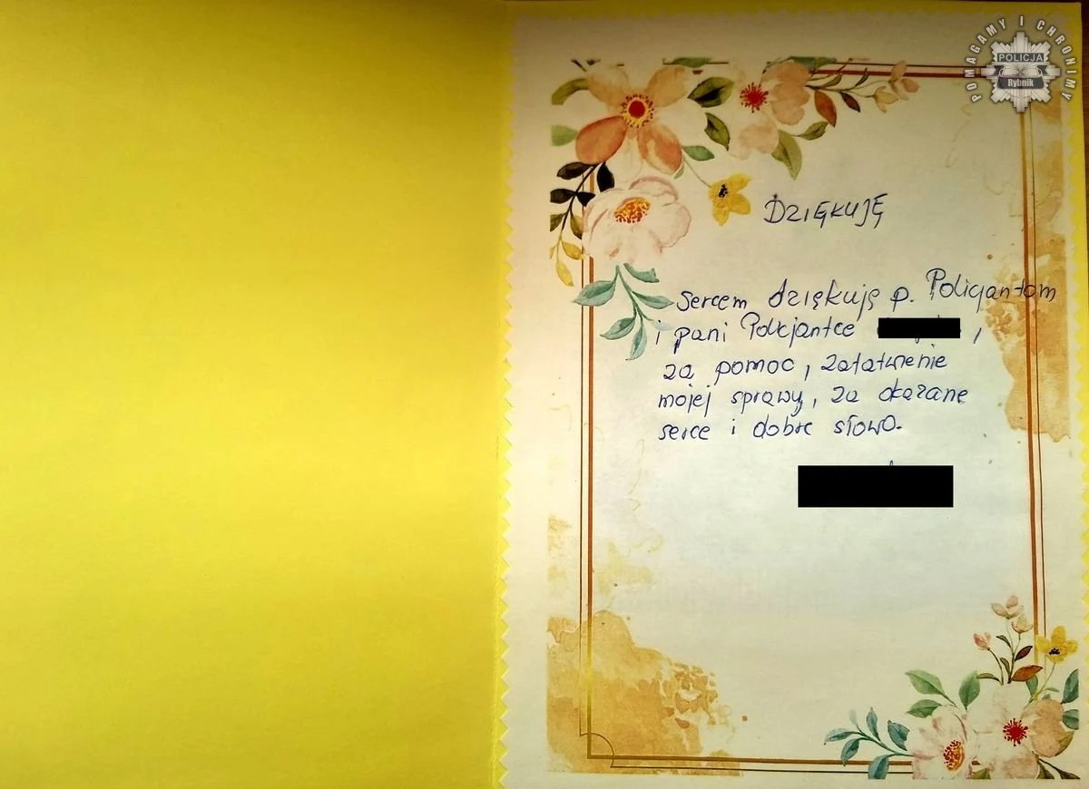 „Sercem dziękuję Panom Policjantom i Pani Policjantce za okazaną pomoc, załatwienie mojej sprawy, za okazane serce i dobre słowo…” Takimi słowami 66-letnia kobieta wyraziła swoją wdzięczność wobec kryminalnych z Rybnika. Własnoręcznie wykonana kartka z podziękowaniami trafiła na ręce Komendanta Miejskiego Policji w Rybniku, inspektora Arkadiusza Więcka.