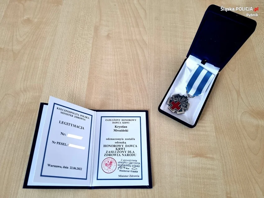 Doskonale wie o tym młodszy aspirant Krystian Mroziński z Wydziału Ruchu Drogowego Komendy Miejskiej Policji w Rybniku, który od wielu już lat jest honorowym krwiodawcą. Wielokrotnie był odznaczany przez Polski Czerwony Krzyż za honorowe oddawanie krwi potrzebującym. Został odznaczony odznakami „Zasłużony Honorowy Dawca Krwi I Stopnia”, „Zasłużony Honorowy Dawca Krwi II Stopnia” i „Zasłużony Honorowy Dawca Krwi III Stopnia”. Teraz kiedy oddał już ponad 22 litrów swojej krwi, Minister Zdrowia odznaczył go odznaką „Honorowy Dawca Krwi – Zasłużony dla Zdrowia Narodu”.