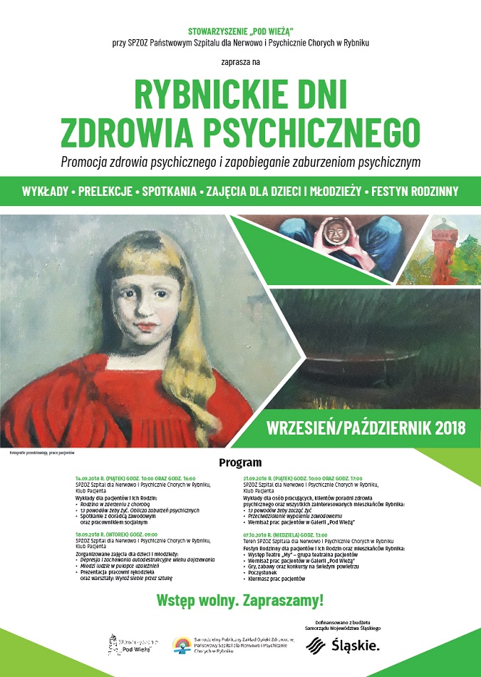 Stowarzyszenie „Pod Wieżą”, działające przy SPZOZ Państwowym Szpitalu dla Nerwowo i Psychicznie Chorych w Rybniku, serdecznie zaprasza wszystkich zainteresowanych mieszkańców Rybnika na wykłady organizowane w dniu 21 września 2018 r. oraz na rodzinny festyn podsumowujący Rybnickie Dni Zdrowia Psychicznego. Wydarzenie związane jest z obchodami Międzynarodowego Dnia Zdrowia Psychicznego, które przypada na dzień 10 października 2018r.
