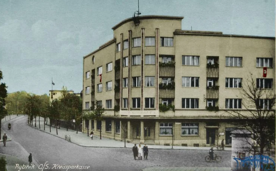 Reprezentacyjny, narożny gmach w stylu funkcjonalistycznym, z charakterystycznym masztem flagowym na szczycie, wybudowany został na potrzeby Komunalnej Kasy Oszczędności w latach 30. XX w. Był jednym z nielicznych zrealizowanych elementów wizji nowoczesnego Rybnika – niezwykłego, wizjonerskiego projektu, jaki marzył się wówczas burmistrzowi Władysławowi Weberowi.