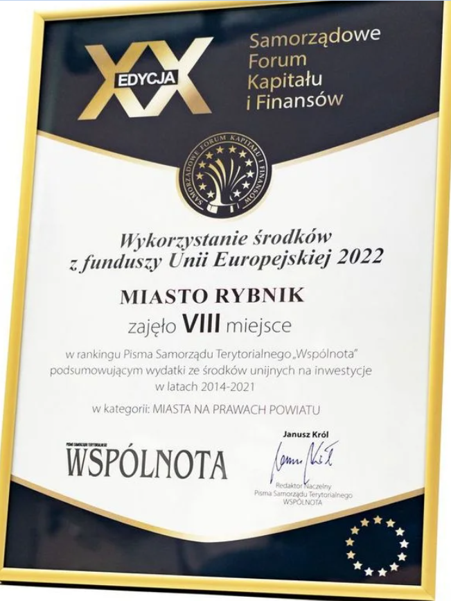 Rybnik zajął VIII miejsce w rankingu Pisma Samorządu Terytorialnego “Wspólnota” podsumowującym wydatki ze środków unijnych na inwestycje w latach 2014-2021.