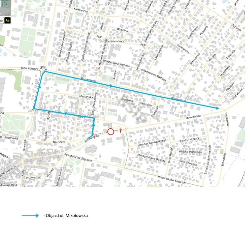 Wyznaczony został objazd: ul. Orzeszkowej, ul. Piasta, ul. Gliwicką, rondo Gliwickie, ul. Wyzwolenia do ulicy Mikołowskiej.