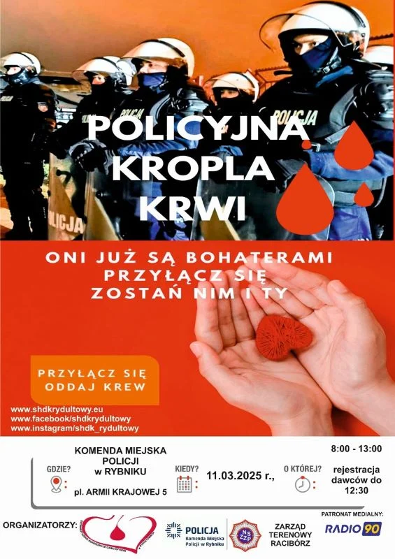 Już 11 marca przed siedzibą Komendy Miejskiej Policji w Rybniku odbędzie się pierwsza w tym roku honorowa zbiórka krwi. Od godziny 8:00 do 13:00 ambulans Regionalnego Centrum Krwiodawstwa i Krwiolecznictwa w Raciborzu będzie przyjmować osoby, które chcą pomóc chorym i rannym.