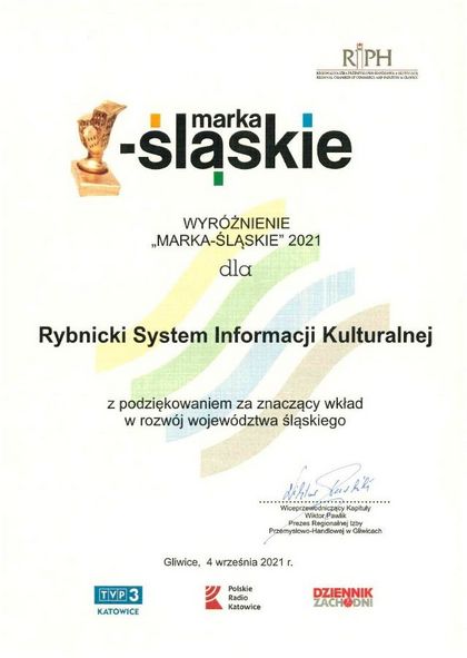 Działania Rybnika docenione za znaczący wkład w rozwój województwa śląskiego! Rybnicki System Informacji Kulturalnej otrzymał wyróżnienia w konkursie Regionalnej Izby Przemysłowo-Handlowejw Gliwicach Marka Śląskie 2021 w kategorii Media.