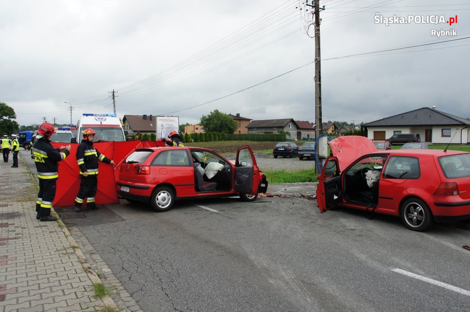 Jak ustalili policjanci z rybnickiej drogówki, 63-latek kierujący volkswagenem golfem, jadąc w kierunku Jejkowic, z nieustalonej dotąd przyczyny zjechał na przeciwny pas drogi i zderzył się czołowo z nadjeżdżającym z przeciwnego kierunku seatem, którym kierowała 46-latka. 63-letni mężczyzna, pomimo podjętej akcji reanimacyjnej, zmarł. Obecny na miejscu prokurator zarządził przeprowadzenie sekcji zwłok. Do szpitala została przewieziona 46-letnia kobieta.
