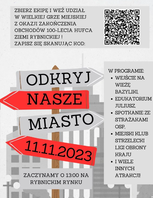 Serdecznie zapraszamy do wzięcia udziału w grze miejskiej. Wystarczy, że zbierzecie ekipę i weźmiecie udział. Szczegóły na plakacie oraz na naszej stronie internetowej www.rybnik.zhp.pl – zapraszają do udziału w przedsięwzięciu rybniccy harcerze.
