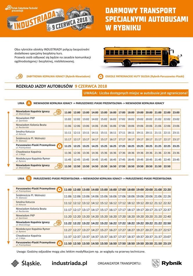 Oba rybnickie obiekty INDUSTRIADY połączy bezpośredni dodatkowy autobus w kolorach nawiązujących do barw INDUSTRIADY. Przewóz osób odbywać się będzie na zasadzie komunikacji ogólnodostępnej i bezpłatnej, niebiletowanej. UWAGA! Liczba miejsc w autobusie ograniczona!