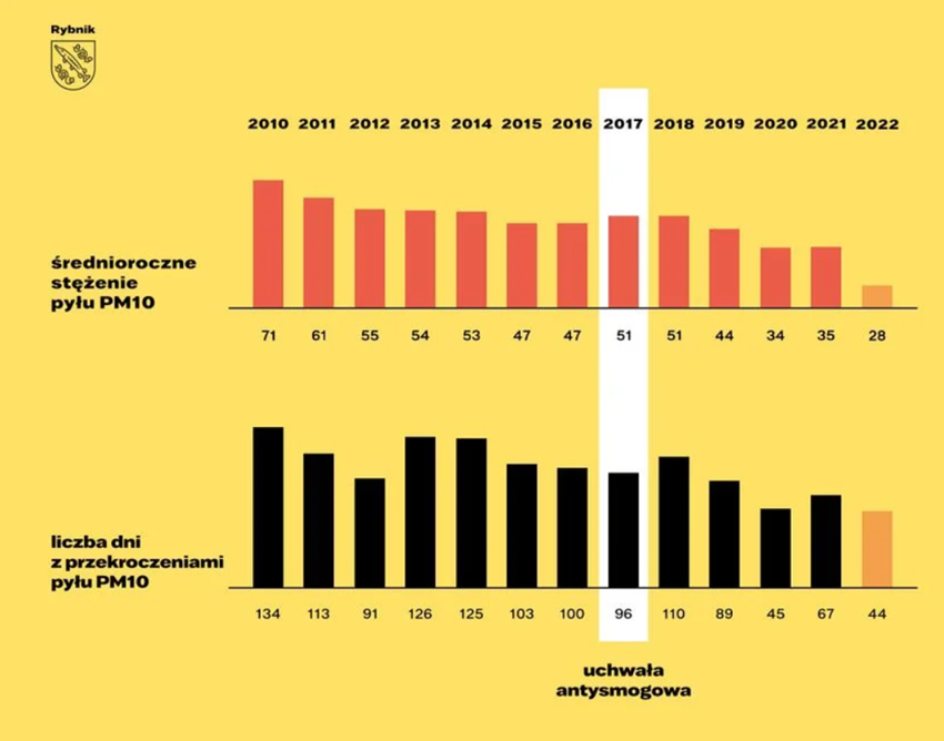 Z danych wynika jednoznacznie, że wartość najważniejszego wskaźnika, tj. średniorocznego stężenia pyłu PM10, osiągnęła poziom 28 µg/m3, co jest najniższym wynikiem w historii pomiarów i wynikiem znacznie poniżej normy wynoszącej maksymalnie 40 µg/m3 średniorocznie. Drugi ze wskaźników opisujących zanieczyszczenie pyłem zawieszonym, tj. liczba dni z przekroczeniami normy PM10, również należy do 2 najniższych w historii pomiarów i wynosi 44. Przekracza co prawda normę o 9 dni, ale i tak notujemy tu znaczny postęp w stosunku do poziomu sprzed wdrażania uchwały antysmogowej – mówi Bartłomiej Kozieł, główny specjalista w Wydziale Rozwoju Urzędu Miasta Rybnika.