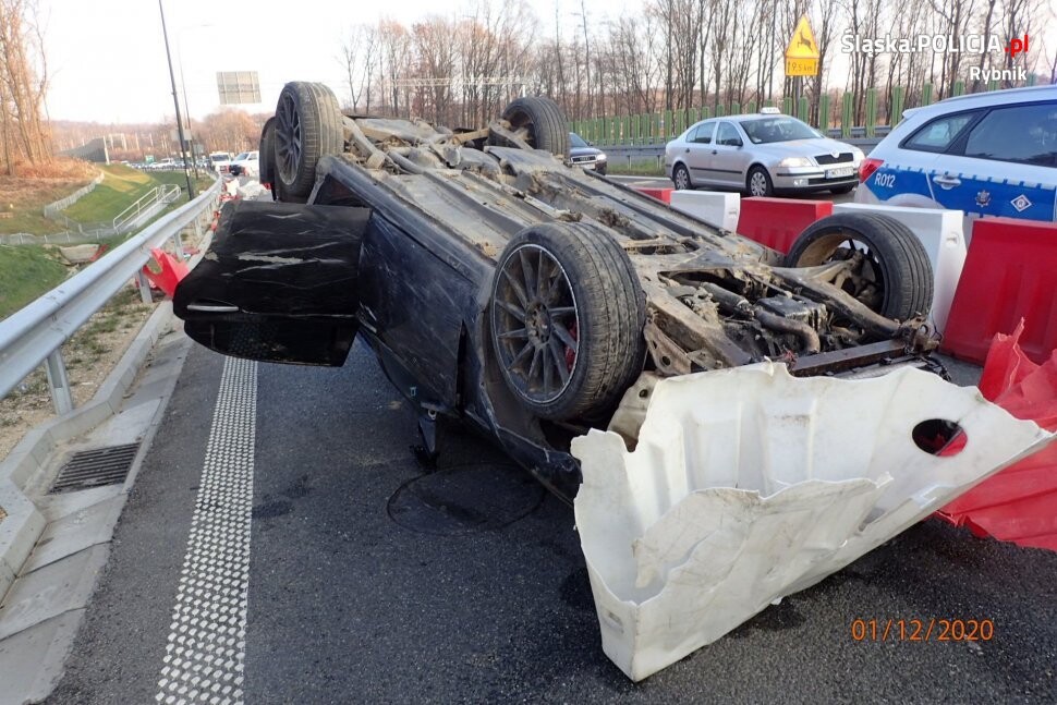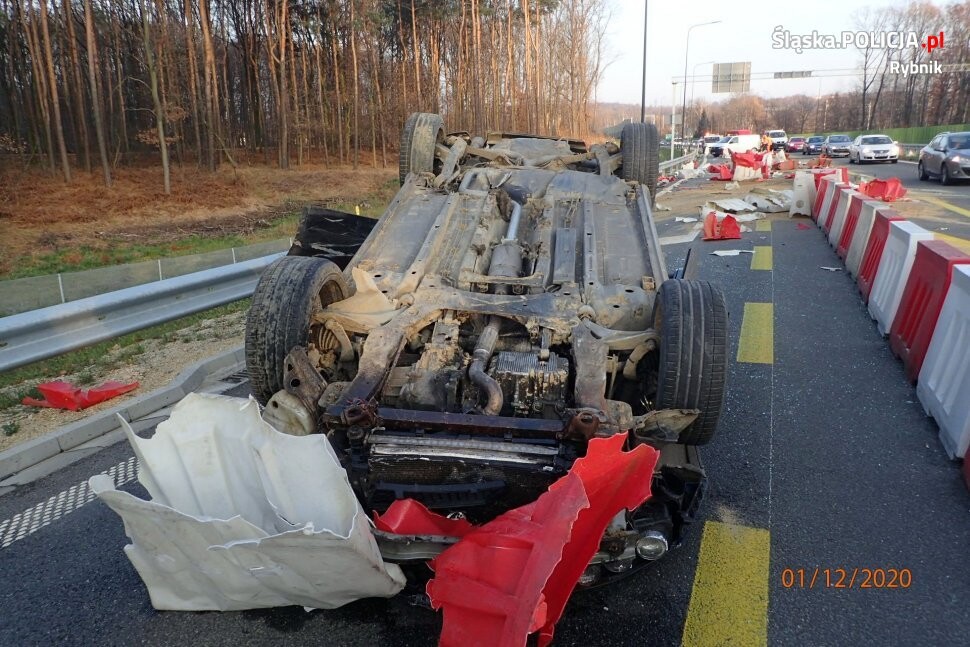 Policjanci ruchu drogowego rybnickiej komendy ustalili, że kierujący alfa romeo jechał z nadmierną prędkością, stracił panowanie nad pojazdem i uderzył w plastikowe zapory, po czym jego samochód dachował. I choć zdarzenie wyglądało bardzo poważnie, nikomu nic się nie stało. Po raz kolejny apelujemy do kierowców - zdejmijcie nogę z gazu! Szczególnie teraz, kiedy zmienna pogoda utrudnia prowadzenie pojazdów.