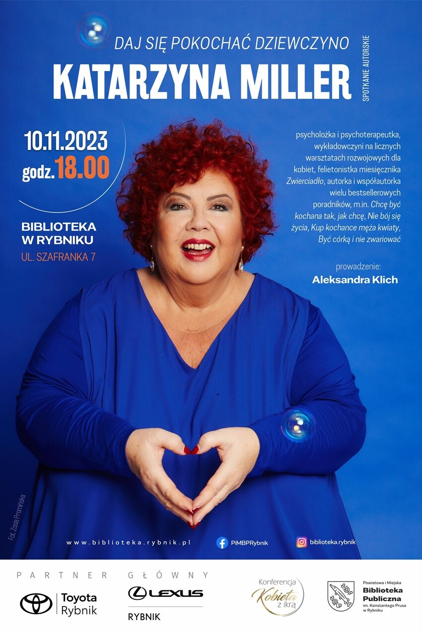 Powiatowa i Miejska Biblioteka Publiczna w Rybniku zaprasza na spotkanie z Katarzyną Miller, psycholożką, psychoterapeutką z kilkudziesięcioletnią praktyką terapeutyczną, wykładowczynią na licznych warsztatach rozwojowych, felietonistką i autorką ponad czterdziestu bestsellerowych książek i poradników, m.in.: „Bez cukru, proszę”, „Być kobietą i wreszcie zwariować” czy „Nie bój się życia”.