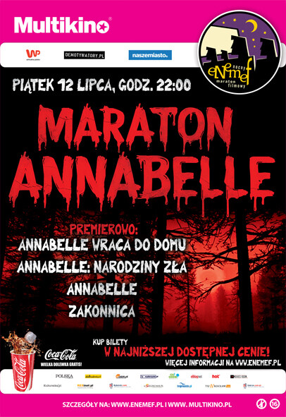 ENEMEF: Maraton Horrorów z Annabelle odbędzie się 12 lipca 2019 r. (piątek) jednocześnie w 30 Multikinach w Polsce: Bydgoszcz, Czechowice-Dziedzice, Elbląg, Gdańsk, Jaworzno, Katowice, Kielce, Koszalin, Kraków, Lublin, Łódź, Olsztyn, Poznań 51, Poznań Malta, Pruszków, Radom, Rumia, Rybnik, Rzeszów, Słupsk, Szczecin, Tychy, Warszawa Targówek, Warszawa Ursynów, Warszawa Wola, Warszawa Złote Tarasy, Włocławek, Wrocław Pasaż Grunwaldzki, Zabrze, Zgorzelec.