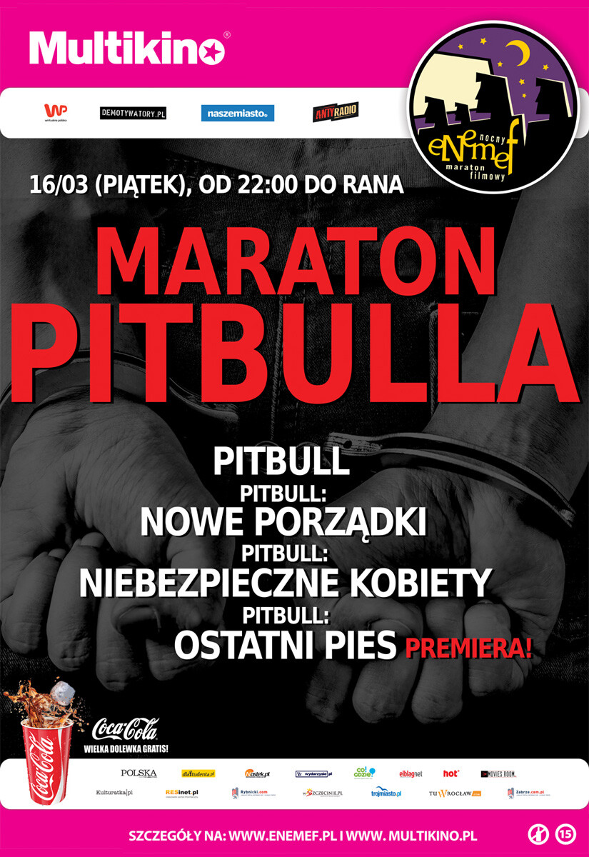 ENEMEF: Maraton Pitbulla odbędzie się 16 marca 2018 r. (piątek) jednocześnie w 30 Multikinach w Polsce: Bydgoszcz, Czechowice-Dziedzice, Elbląg, Gdańsk, Gdynia, Jaworzno, Katowice, Kielce, Koszalin, Kraków, Lublin, Łódź, Olsztyn, Poznań 51, Poznań Malta, Radom, Rumia, Rybnik, Rzeszów, Słupsk, Szczecin, Tychy, Warszawa Targówek, Warszawa Ursynów, Warszawa Wola Park, Warszawa Złote Tarasy, Włocławek, Wrocław Pasaż, Zabrze, Zgorzelec.