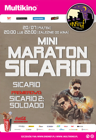 ENEMEF: Minimaraton Sicario odbędzie się 20 lipca 2018 r. (piątek) jednocześnie w 29 Multikinach w Polsce, o godzinie 20:00 (Elbląg, Jaworzno, Katowice, Kielce, Kraków, Lublin, Olsztyn, Poznań Malta, Rybnik, Rzeszów, Szczecin, Warszawa Targówek, Warszawa Ursynów, Warszawa Wola) lub o 22:00 (Bydgoszcz, Czechowice-Dziedzice, Gdańsk, Gdynia, Koszalin, Łódź, Poznań 51, Radom, Rumia, Słupsk, Tychy, Warszawa Złote Tarasy, Włocławek, Wrocław Pasaż Grunwaldzki, Zabrze).