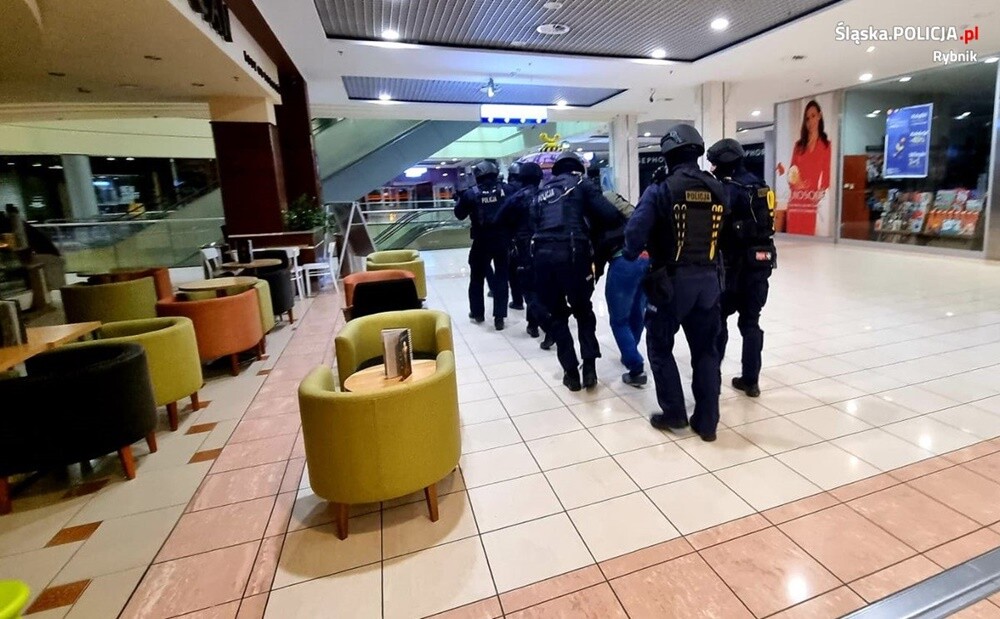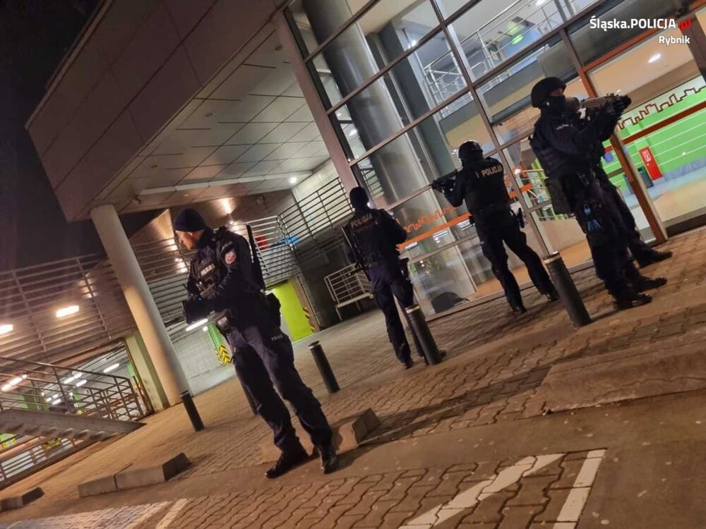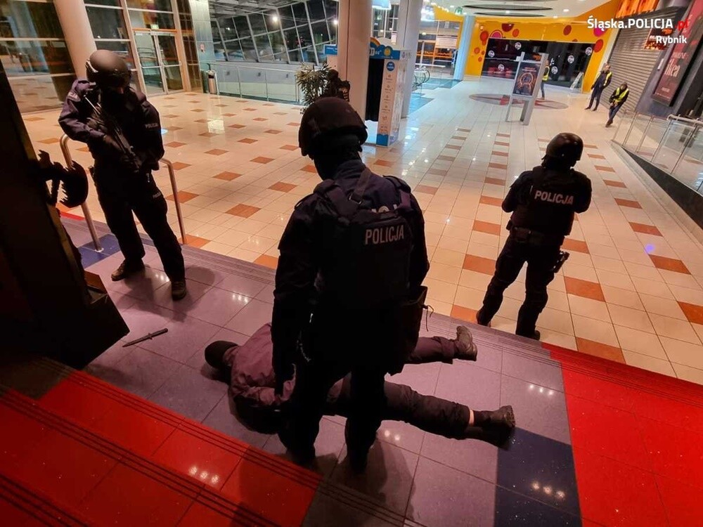 We wtorek, około godziny 01.00 dyżurny rybnickiej komendy został powiadomiony telefonicznie przez ochronę galerii handlowej przy ulicy Raciborskiej o dwóch osobach, które weszły na teren obiektu przed jego zamknięciem i zaczęły zaczepiać klientów oraz zachowywać się agresywnie. Podczas interwencji pracowników ochrony, zaczęli grozić nożami i wykrzykiwać "że wysadzą i spalą budynek...". Jedna z osób postronnych została raniona nożem. Pracownicy ochrony odstąpili od dalszej interwencji, ewakuowali poszkodowanego, udzielając mu pierwszej pomocy przedmedycznej. Następnie kierownik ochrony podjął decyzję o ewakuacji pozostałych klientów.