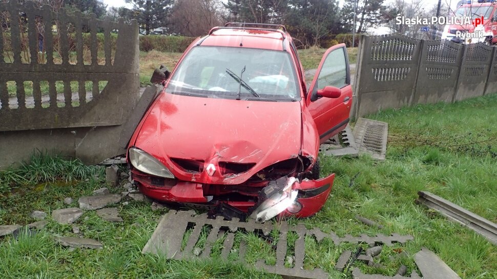 Jak ustalili policjanci wydziału ruchu drogowego rybnickiej komendy, kierujący renault, jadąc w kierunku ulicy Mglistej, z nieznanych przyczyn zjechał na przeciwległy pas ruchu, a następnie odbił w prawo, przejechał przez chodnik, pas zieleni, po czym uderzył w ogrodzenie posesji.