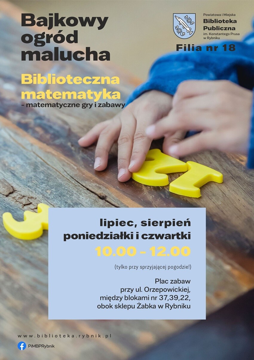 W tym roku plenerowe zajęcia w ramach Bajkowego ogrodu malucha zorganizowane zostaną pod hasłem „Biblioteczna matematyka”. Matematyczne gry i zabawy w plenerze będą odbywać się w lipcu i sierpniu na placu zabaw przy ul. Orzepowickiej, w poniedziałki i czwartki od godz. 10:00 do 12:00 (tylko przy sprzyjającej pogodzie). W ramach zajęć zaplanowano dwa plenerowe teatrzyki, które wystawi grupa teatralna Bajkowe Skarbki Śląska: