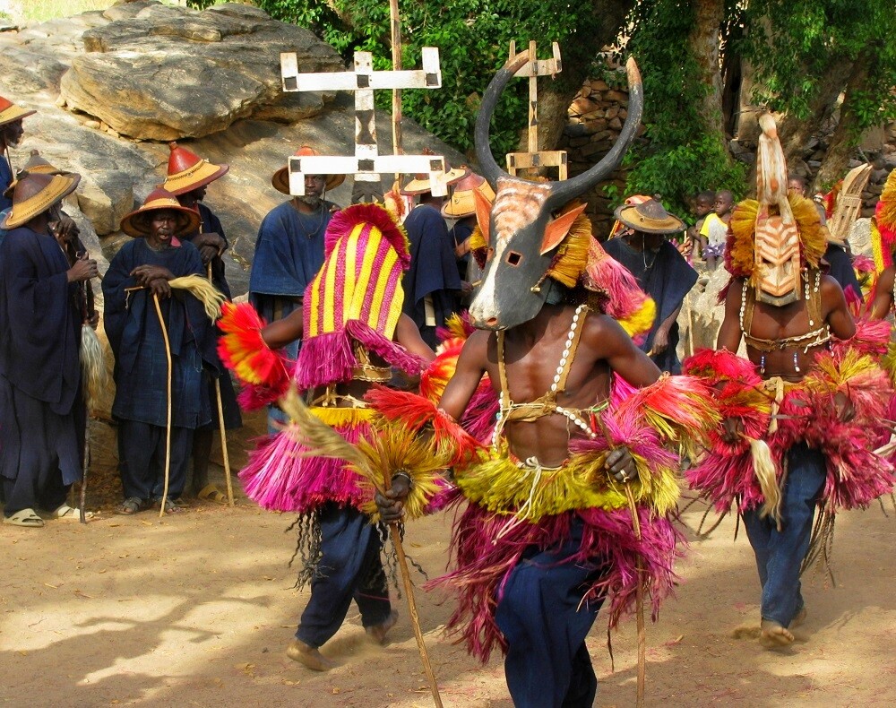 Najpierw pojawiają się starcy. Idą ze śpiewem w słomianych kapeluszach ze skórzanymi kończykami, w rogatych czapeczkach goro, w długich granatowych tunikach. Niosą bębny i metalowe dzwonki. Za nimi na plac pod baobabami wbiegają tancerze. Pod skórą nagich torsów grają mięśnie, wokół bioder i kostek wirują amarantowo-żółte spódniczki i bransolety, stopy mocno wybijają rytm w pyle. Twarze skrywają drewniane maski: małe i wielkie, kolorowe lub czarno-białe, kształtami przypominające zwierzęta, magiczne przedmioty, dziwaczne postaci. Tancerze wywijają nimi do rytmu, potrząsają raz zabawnie, raz groźnie. Odgrywają sceny, tworzą korowody, tańczą w zapamiętaniu, a gdy słońce chowa się za pobliską skałą znikają wśród plątaniny glinianych domów i spichrzów w słomianych czapkach.