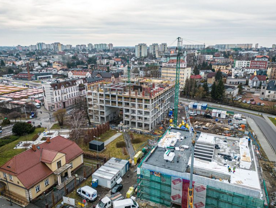 – Jeżeli chodzi o nowo budowany budynek C, to trwają roboty stanu surowego. Zakończono montaż ostatnich części konstrukcji stalowej, trwa deskowanie i zbrojenie ostatniej części stropu nad kondygnacją +4, trwa deskowanie, zbrojenie i betonowanie ścian i filarków ostatniej kondygnacji +5, trwa też murowanie ścian działowych na kondygnacjach 0 – +3. Dodatkowo rozpoczęto układanie instalacji elektrycznych podtynkowych w mieszkaniach – dodaje Zaraś.
