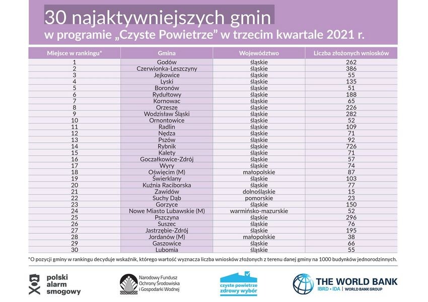 Opublikowany ranking oparty jest o liczbę wniosków złożonych w gminie i liczbę budynków jednorodzinnych. Obejmuje aktywność gmin w trzecim kwartale bieżącego roku (od 1 lipca do 30 września 2021 r.) i powstał przy współpracy NFOŚiGW, PAS i Banku Światowego.
