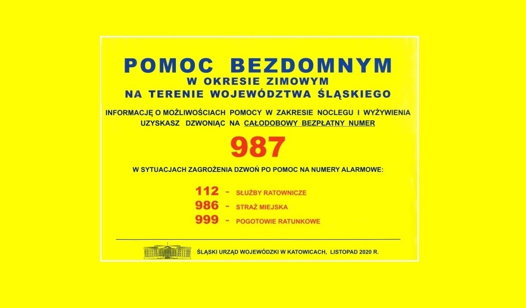Przypominamy, że co roku, od 1 listopada do 31 marca, działa specjalna, całodobowa infolinia, obejmująca teren całego województwa śląskiego, gdzie pod numerem telefonu 987 można uzyskać informację o możliwości pomocy osobom bezdomnym. - czytamy na stronie KMP Rybnik