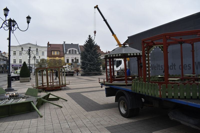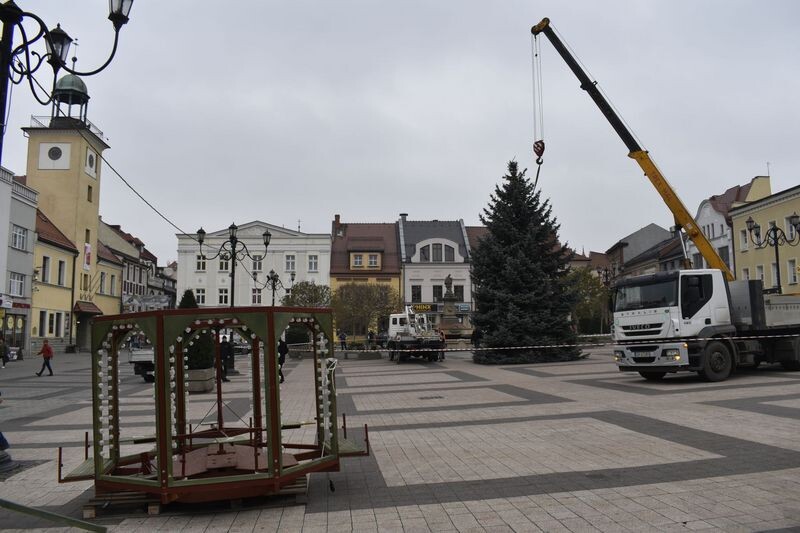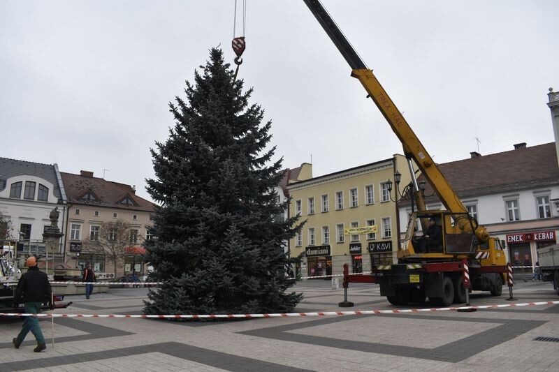 Na rybnickim rynku stanęła 10-metrowa choinka. Od kilku dni w wielu częściach miasta sukcesywnie montowane są świąteczne ozdoby ledowe.