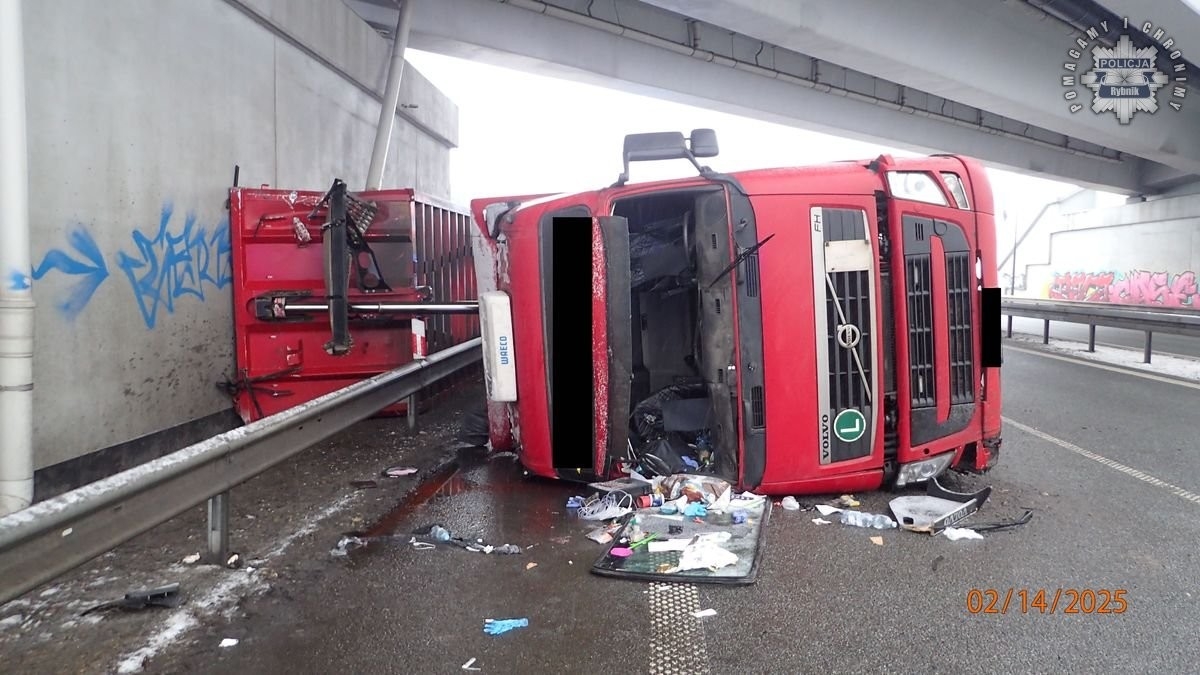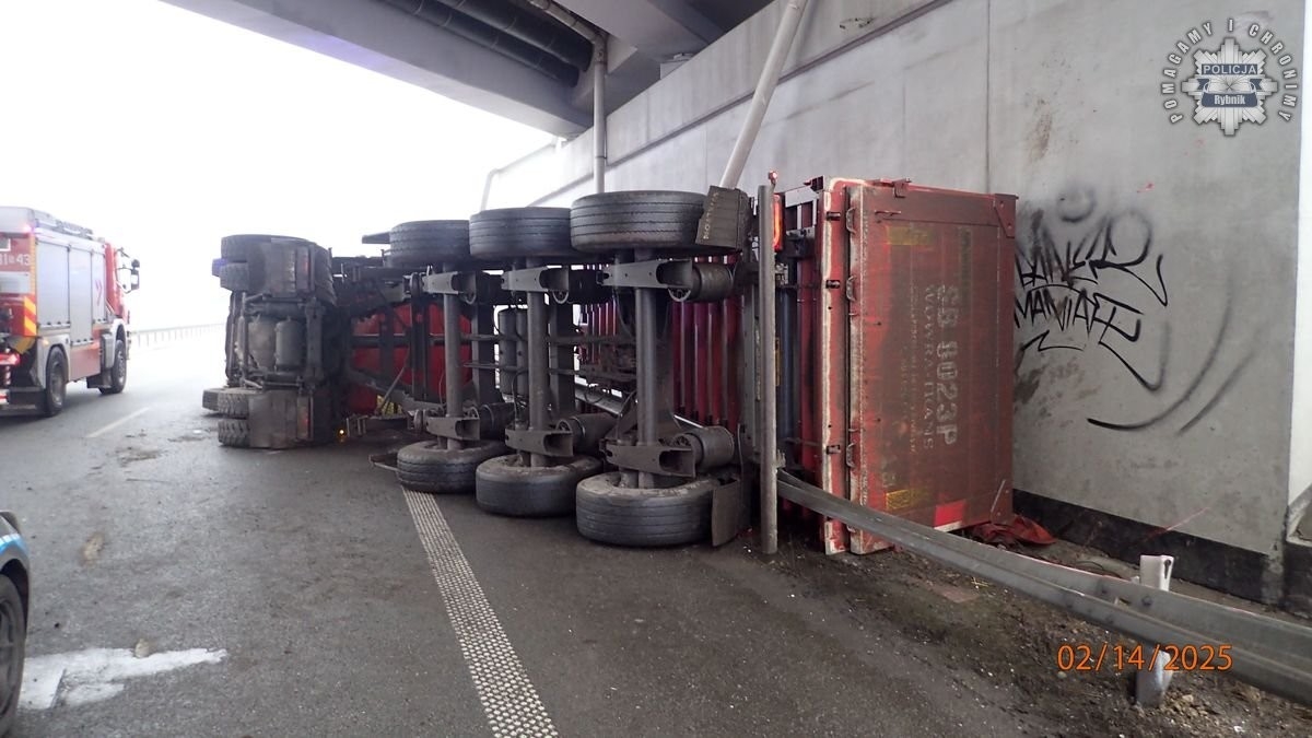 Rybniccy śledczy ustalają przyczyny i okoliczności tragicznego wypadku, do którego doszło w piątek na Drodze Regionalnej 935. Jak ustalili policjanci z ruchu drogowego, kierujący samochodem ciężarowym marki Volvo wraz z naczepą, mając uniesioną w połowie naczepę samowyładowczą, uderzył w bramownicę znajdującą się nad jezdnią, barierę ochronną, a następnie w wiadukt, w wyniku czego doszło do wywrócenia się pojazdu.