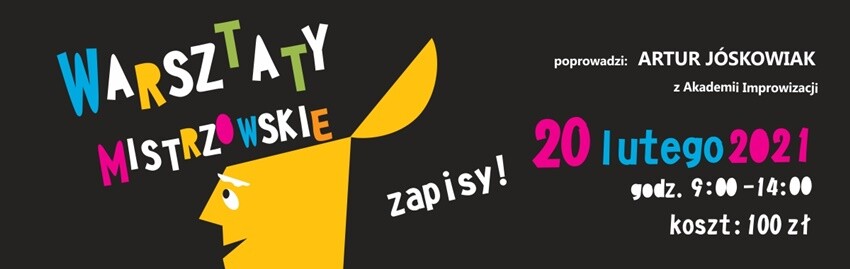 Warsztat poprowadzi Artur Jóskowiak - aktor improwizator, nauczyciel, trener improwizacji oraz biznesu, komik, absolwent filologii polskiej na Uniwersytecie Wrocławskim, współzałożyciel Teatru Improwizacji IMPROKRACJA www.improkracja.pl, duetów Dwaj Panowie oraz Artur i Tomek. Uczył się od trenerów m.in. z USA, Austrii, Wielkiej Brytanii, Francji, Izraela, Argentyny, Słowenii. Współzałożyciel Akademii Improwizacji www.akademiaimprowizacji.pl - jednego z najlepszych ośrodków w Polsce prowadzących warsztaty i szkolenia na bazie współczesnej improwizacji teatralnej. Dyrektor artystyczny Dolnośląskiego Festiwalu Improwizacji Teatralnej DOLi. Ze sceną związany od 2006 roku. Strona FB.