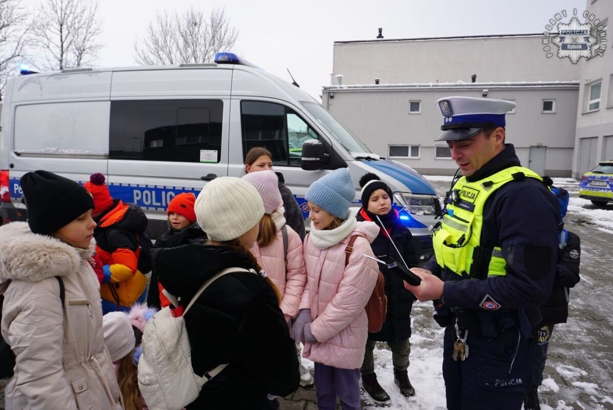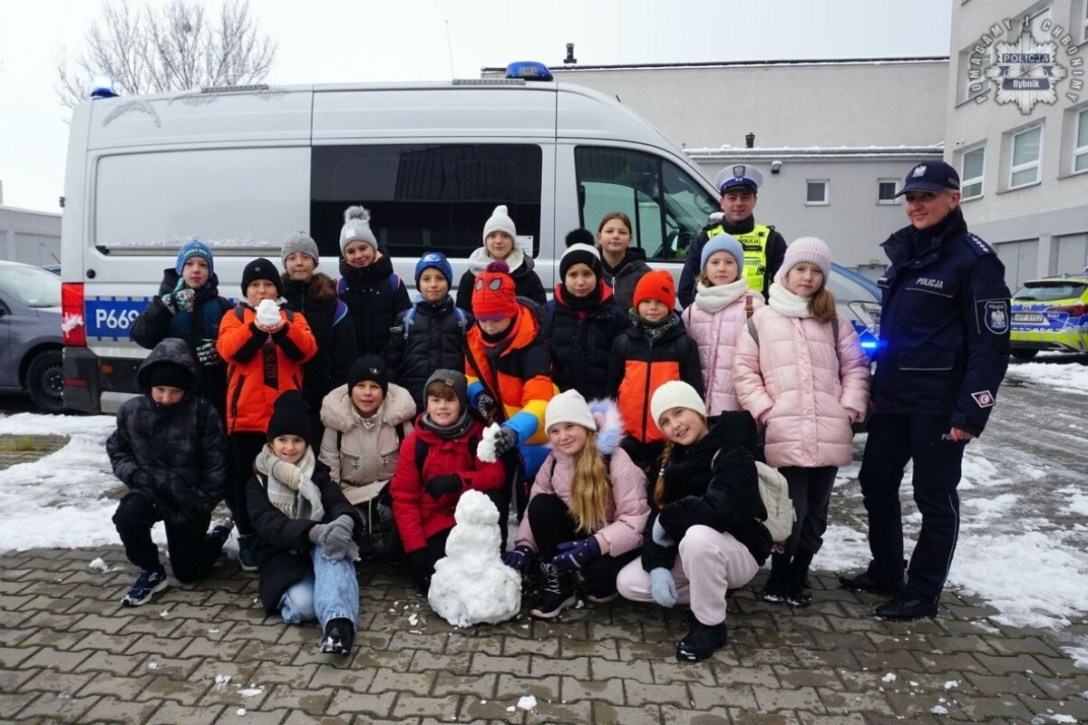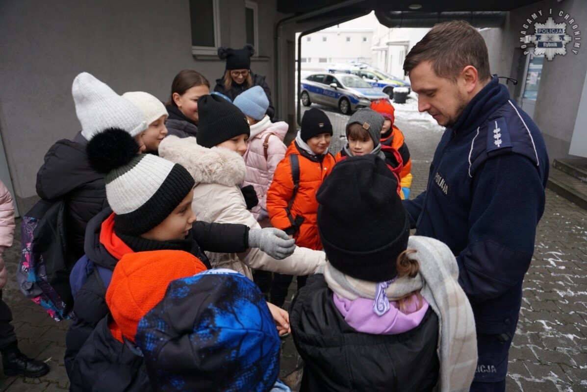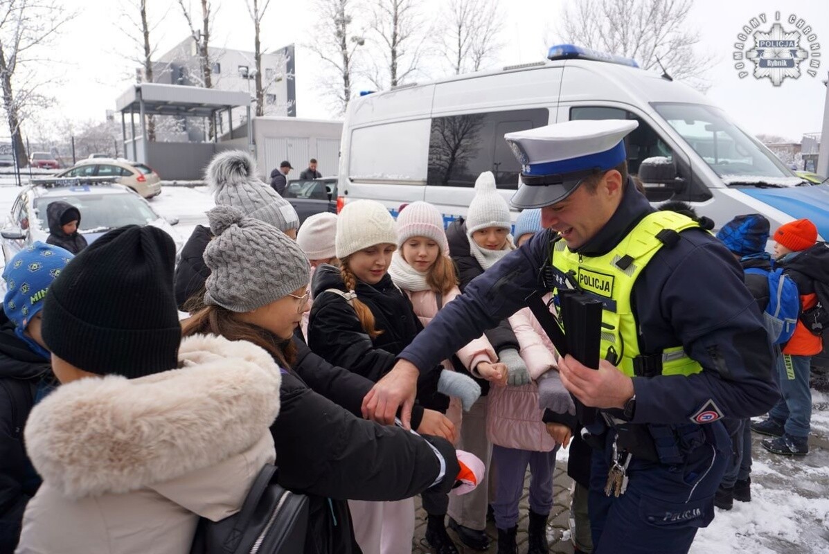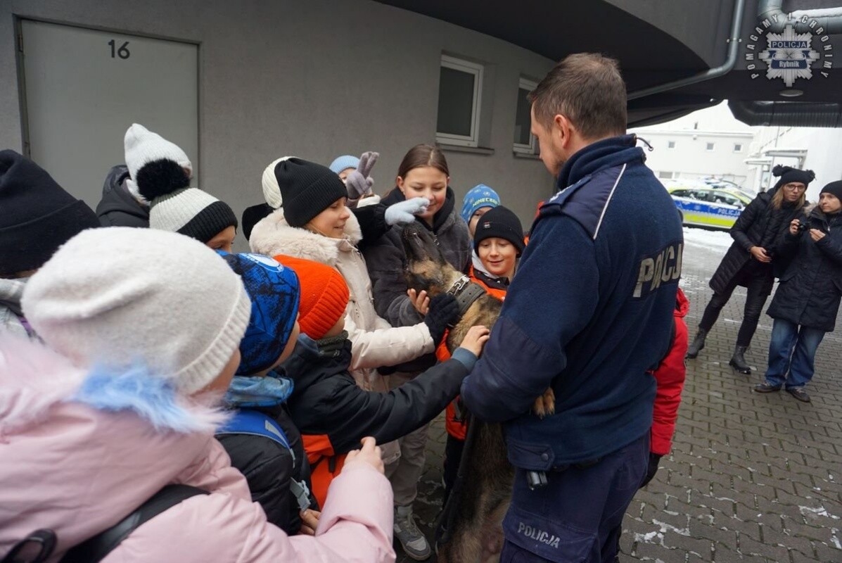 Rybnicką komendę odwiedziły dzieci ze Szkoły Podstawowej w Świerklanach. Najmłodsi wysłuchali prelekcji na temat bezpieczeństwa podczas zimowego wypoczynku, a także bezpiecznego poruszania się po drodze. Milusińscy mieli okazję poznać pracę mundurowych oraz z bliska zobaczyć sprzęt wykorzystywany w codziennej służbie. Dużym zainteresowaniem wśród uczniów cieszył się policyjny przewodnik i jego pupil.