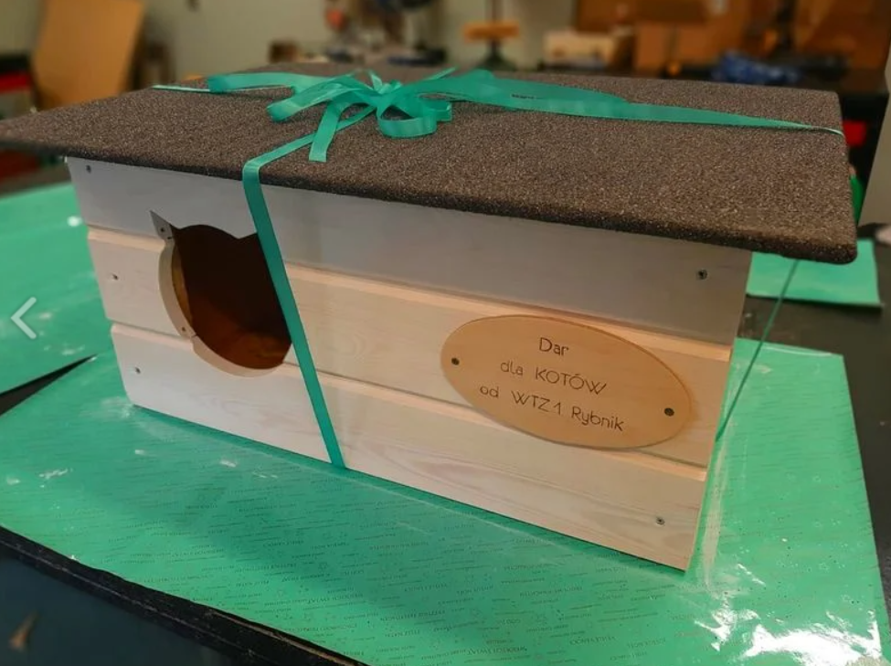 Drewniane budki, wykonane przez warsztatowiczów w ramach zajęć terapeutycznych w pracowniach technicznej i stolarskiej, przekazane zostały opiekunom, którzy społecznie zajmują się opieką i dokarmianiem żyjących na terenie Rybnika bezdomnych kotów.