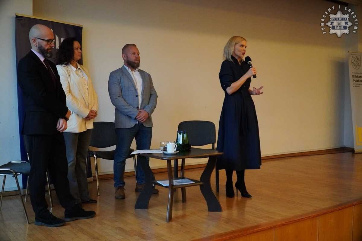 Głos zabrała również pani Alicja Satlawa-Janiec - psycholog, psychoterapeuta, specjalista uzależnień. Zaakcentowała ona, że przestępstwa z nienawiści są szczególnym rodzajem przestępczości. Ich ofiarami mogą paść osoby z powodu swojej rasy, narodowości, pochodzenia etnicznego, języka, koloru skóry, religii, niepełnosprawności, czy wielu innych cech. Pani psycholog przekonywała, że gdy jesteśmy ofiarami lub świadkami mowy nienawiści, nie należy bać się reagować.