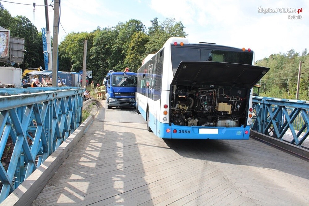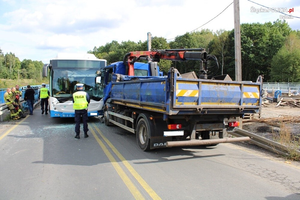 Do wypadku doszło dzisiaj, około godziny 10.30 na ulicy Mikołowskiej w Rybniku. Jak ustalili policjanci z rybnickiej drogówki, kierujący autobusem komunikacji miejskiej, 50-letni mieszkaniec Żor, jadąc w kierunku ulicy Sosnowej, zjechał na przeciwległy pas ruchu, w wyniku czego zderzył się ze stojącym, oczekującym na wolny przejazd samochodem ciężarowym. Wskutek uderzenia, część pasażerów przewróciła się w autobusie. Poszkodowana została 14-latka, 66-latka oraz 75-latka, które zostały zabrane do szpitala. Pozostali pasażerowie, po zaopatrzeniu przez załogę pogotowia ratunkowego, zostali zwolnieni do domu. Uczestnicy zdarzenia byli trzeźwi. Droga na tym odcinku została całkowicie zablokowana na około 2 godziny.