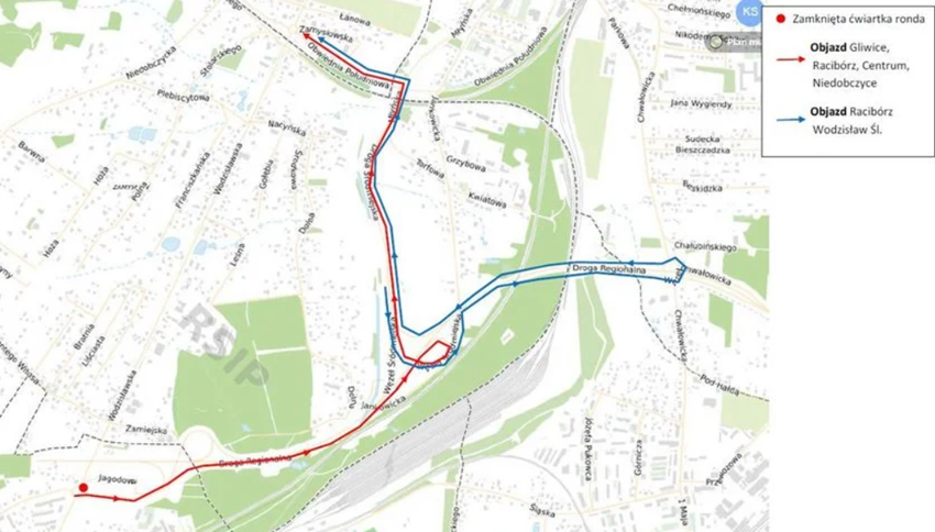 - Objazd Gliwice, Racibórz, Centrum, Niedobczyce - od ul. Hetmańskiej i ul. Wodzisławskiej: