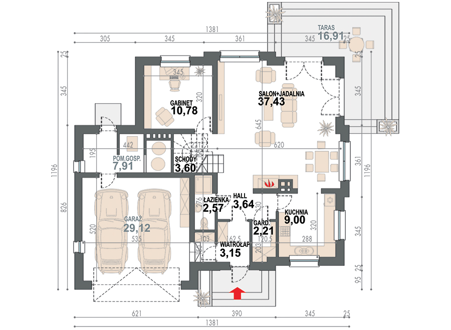 Rzut parteru w projekcie gotowym https://www.dominanta.pl/projekty-domow